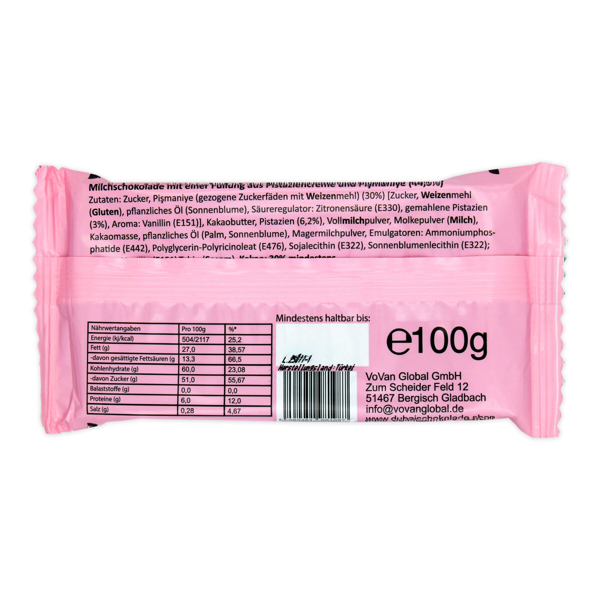 Zucker, Pismaniye (gezogene Zuckerfäden mit Weizenmehl) (30%) [Zucker, Weizenmehl (Gluten)], pflanzliches Öl (Sonnenblume), Säureregulator: Zitronensäure (E330), gemahlene Pistazien (3%), Aroma: Vanillin (E1511), Kakaobutter, Pistazien (6,2%), Vollmilchpulver, Molkepulver (Milch), Kakaomasse, pflanzliches Öl (Palm, Sonnenblume), Magermilchpulver, Emulgatoren: Ammoniumphosphatide (E442), Polyglycerin-Polyricinoleat (E476), Sojalecithin (E322), Sonnenblumenlecithin (E322)
