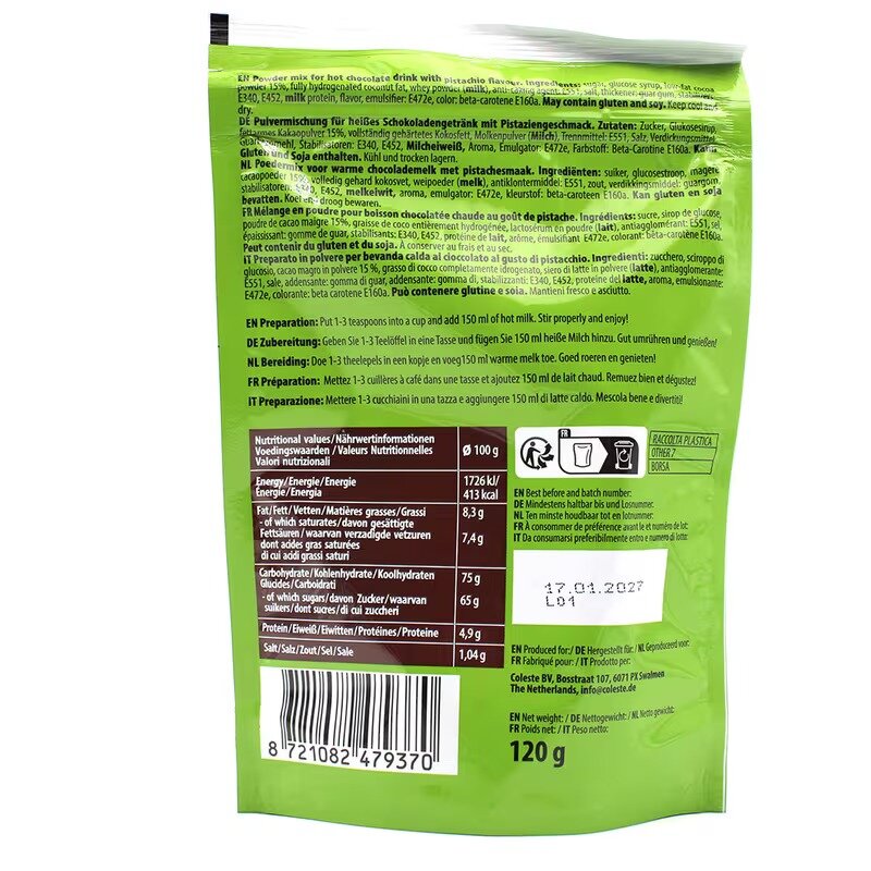 Genieße die Barò Dilli Hot Chocolate mit einem reichhaltigen Pistazien-Geschmack! Hergestellt in den Niederlanden von Coleste BV, bietet dieses luxuriöse Getränk eine perfekte Mischung aus samtiger Schokolade und dem feinen Aroma von Pistazien.