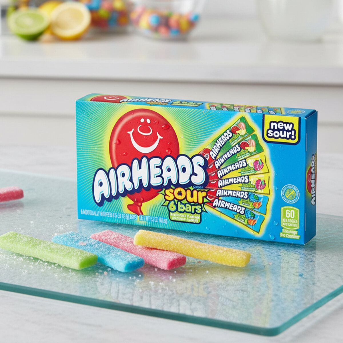 Erlebe mit den Airheads Sour das volle Kaubonbon-Vergnügen: sechs bunte, fruchtige Riegel in verschiedenen Sorten – alle mit dem besonderen extra-sauren Kick. Das Kult-Süßigkeit aus den USA, perfekt zum Teilen, Snacken oder Sammeln.