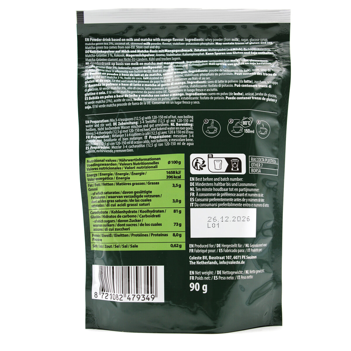 Molkepulver (aus Milch), Zucker, Glukosesirup, Matcha-Grüntee (1%), Maltodextrin, Mangopulver, Aromen, Stabilisator: Kaliumphosphate; Trennmittel: Siliciumdioxid.
