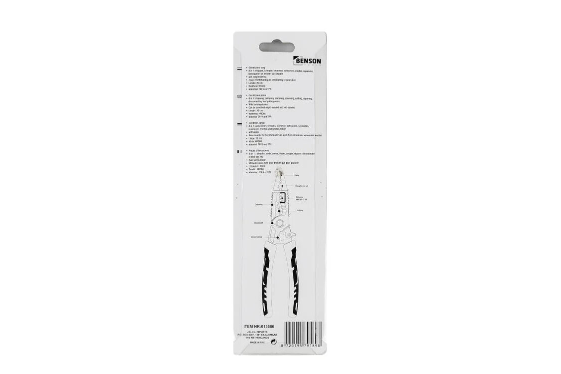 Die Benson Elektrikerzange 8-in-1 vereint mehrere Werkzeuge in einer kompakten Lösung. Ideal für Elektroarbeiten, Reparaturen und Installationen im Haushalt oder in der Werkstatt.