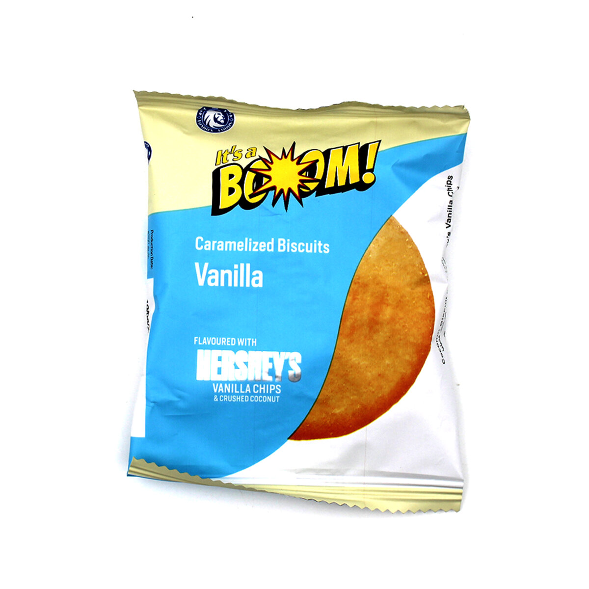 Der It’s a Boom! Caramelized Biscuit Vanilla ist ein knusprig karamellisierter Einzelkeks mit feiner Vanillenote, veredelt mit HERSHEY’S Vanilla Chips und Kokosraspeln. Perfekt portioniert für kleine Genussmomente unterwegs.