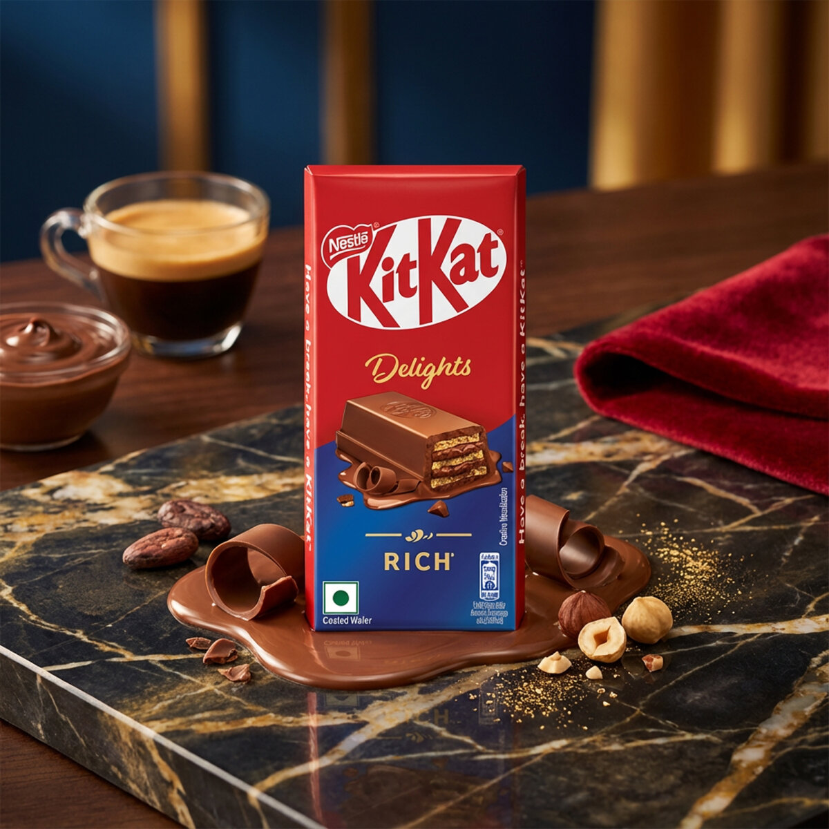 Erleben Sie den unvergleichlichen Geschmack von KitKat Delights Rich! Diese besondere Edition aus Indien bietet extra viel cremige Milchschokolade (68,8%) und knusprige Waffelschichten fuer ein intensives Geschmackserlebnis.