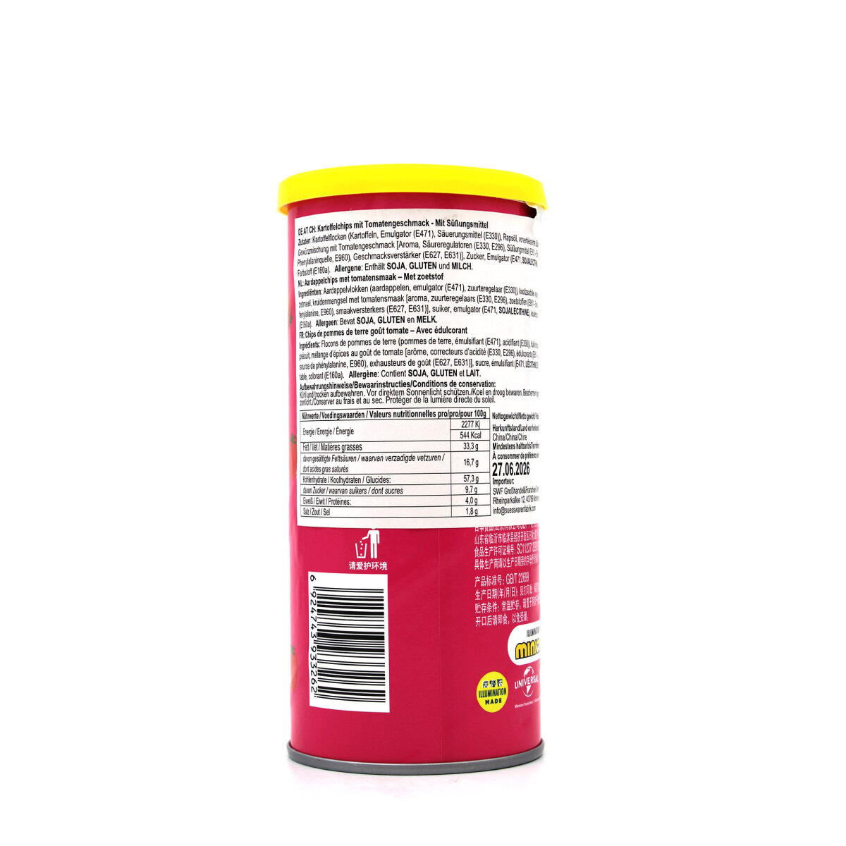 Kartoffelflocken, Pflanzenöl (Palmöl), Stärke, Zucker, Tomatenpulver, Salz, Aroma (Tomatenaroma, Hefeextrakt, Zwiebelpulver, Gewürze), Säuerungsmittel (Zitronensäure, Apfelsäure), Geschmacksverstärker (E621, E627, E631), Süßungsmittel (Sucralose), Farbstoff (E160c).