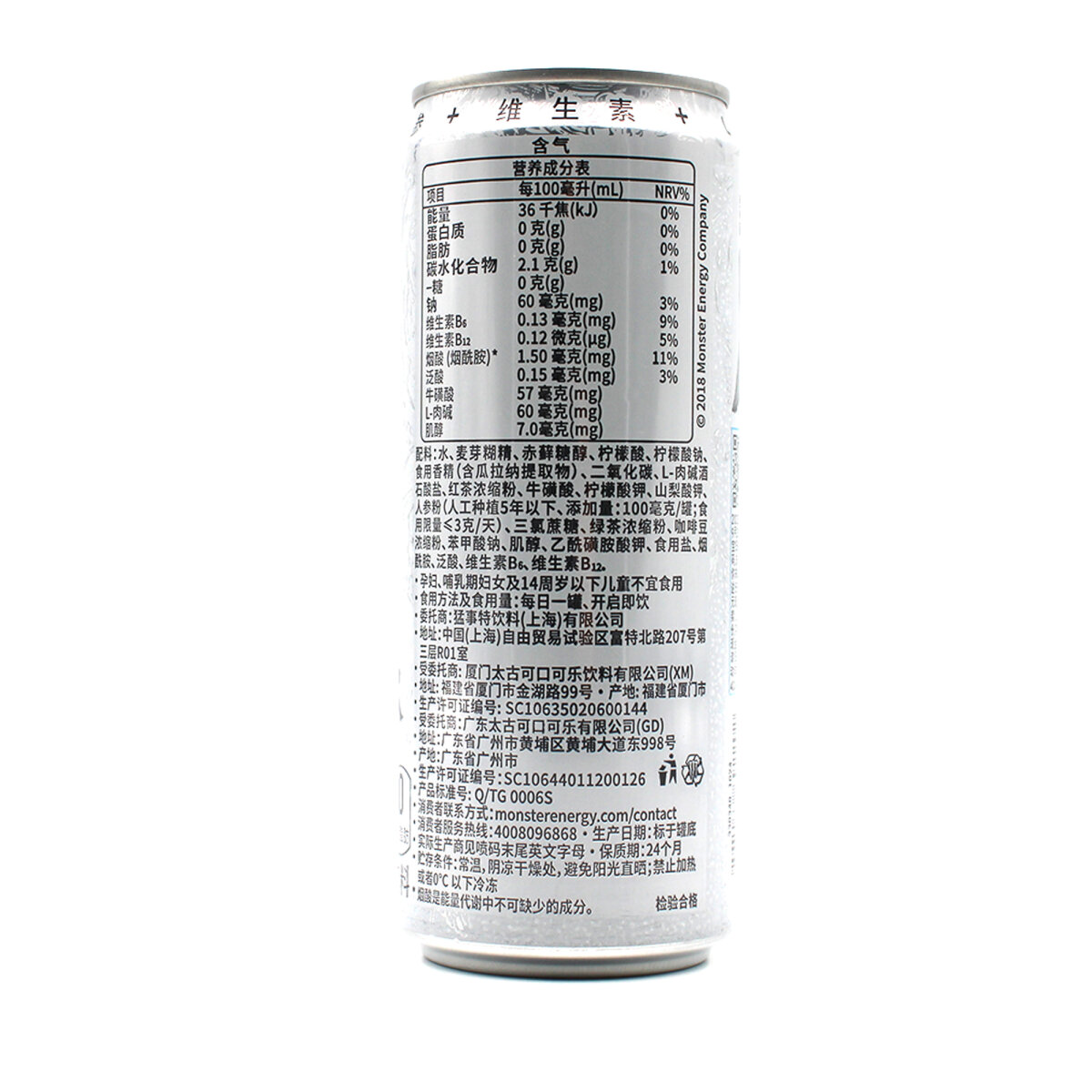 Wasser, Kohlensäure, Säuerungsmittel (Zitronensäure), Taurin, L-Carnitin, Koffein, Ginsengextrakt, Süßungsmittel (Sucralose, Acesulfam-K), Vitamine (B2, B3, B6, B12), Aroma. Enthält Koffein. Nicht empfohlen für Kinder, Schwangere oder koffeinempfindliche Personen.