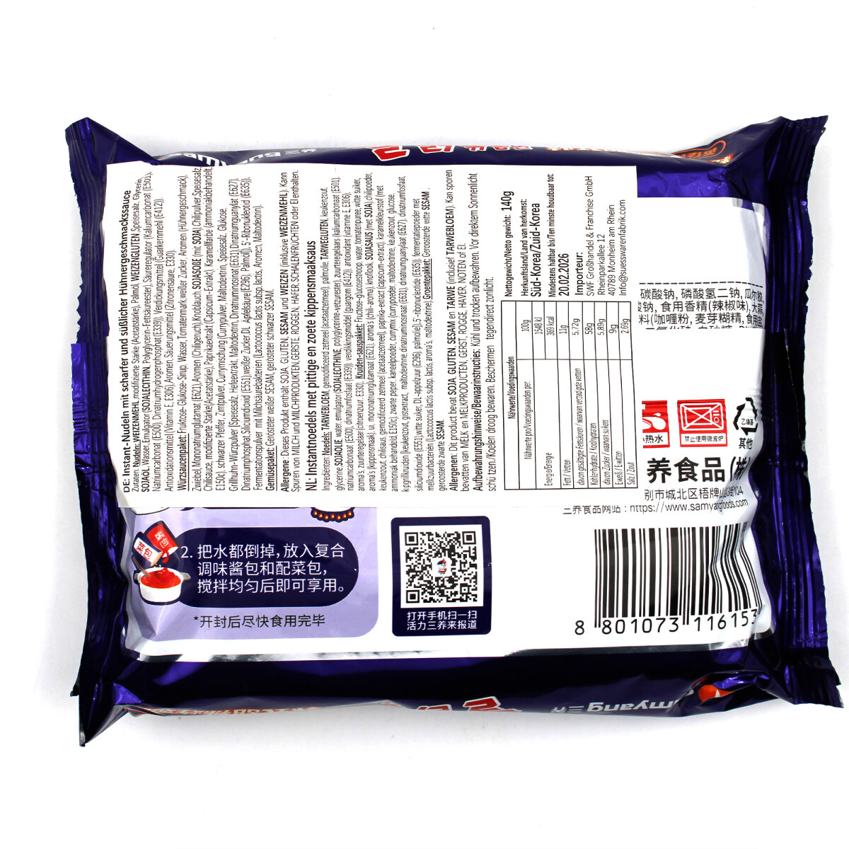Nudeln (Weizenmehl, Palmöl, modifizierte Tapiokastärke, Gluten, Salz, Verdickungsmittel (E412), Säureregulator (E501), Farbstoff (E101)), Sauce (Wasser, Zucker, Sojasauce, rote Paprika, Chilipaste (Gochujang), Knoblauch, Zwiebel, Hefeextrakt, Aromen, Pfeffer, Curry, Sesamöl, Paprikapulver).