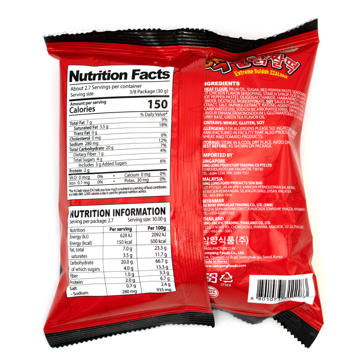 Zutaten: Weizenmehl, Palmöl, Zucker, Gewürze mit roter Pfefferpaste, Hühner-Aroma, Stärkesirup, Gochujang (scharfe Paprikapaste), Oligosaccharide, Habanero-Aroma-Pulver, Dextrose-Monohydrat, Sojasaucen-Pulver, Chili-Extrakt, Salz, Paprika-Extrakt, Backtriebmittel (Ammoniumbicarbonat E503, Natriumbicarbonat E500(ii)), Raucharoma, Geschmacksverstärker (Mononatrium-L-Glutamat E621), Hühner-Curry-Basis, Grüntee-Aromaöl.