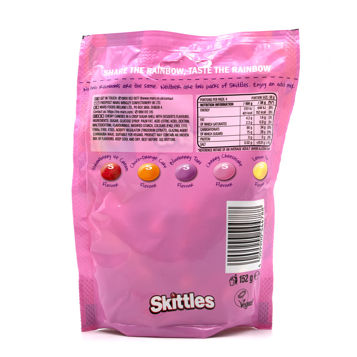 Entdecke die einzigartige Skittles Desserts 152 g Edition: klassische Skittles mit einem fruchtig-cremigen Twist, inspiriert von beliebten Dessert-Geschmäckern.