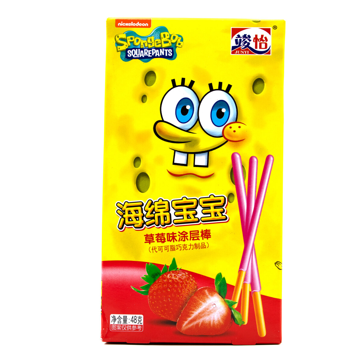 Knusprige SpongeBob Erdbeer-Kekssticks vom asiatischen Hersteller Junyi – offiziell lizenziert von Nickelodeon. Diese süßen Keksstäbchen sind mit einer cremigen weißen Schokolade überzogen, die nach frischer Erdbeere schmeckt. Der perfekte Snack für alle SpongeBob-Fans und Liebhaber von asiatischen Süßigkeiten.